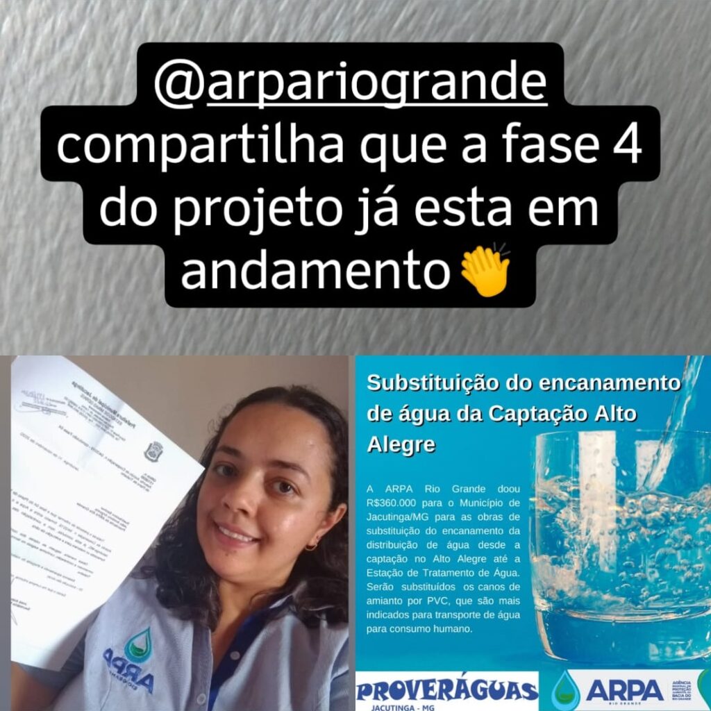 A ARPA Rio Grande doou R$360.000,00 para o Município de Jacutinga/MG para as obras de substituição do encanamento de distribuição de água desde a captação no Alto Alegre até a Estação de Tratamento de água. Serão substituídos os canos de amianto por PVC, que são mais indicados para transporte de água para consumo humano.